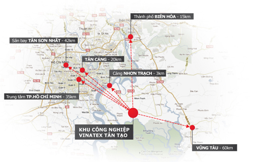 KCN Vinatex – Tân Tạo là KCN đa ngành, nằm ở 2 xã Hiệp Phước và Phước An, huyện Nhơn Trạch tỉnh Đồng Nai. Với vị trí địa lý đặc biệt thuận lợi: cách TP.HCM 60km, cách Biên Hòa 40km, và cách Bà Rịa – Vũng Tàu 60km; được xem là trung tâm 3 cực của vùng kinh tế trọng điểm phía Nam, rất thuận lợi cho việc lưu thông hàng hoá xuất nhập khẩu và tổ chức tiêu thụ nội địa.